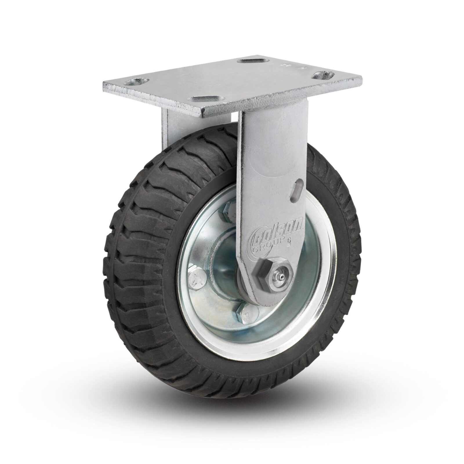 8″ x 2″ rigid caster with black tread from the Albion 170 Economical Kingpinless series with a 9-1/2″ overall height. A rubber model with an 280lbs. caster load capacity is cost effective, offers great shock absorption, and quiet mobility. Use this Economical Kingpinless caster for applications where kingpin casters are not effective enough to hold up to the shock or impact you’re excepted to need. Typical applications: dollies, dough troughs, platform trucks, tow line, utility carts, tooling fixtures, and scrap metal carriers.