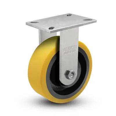 Albion 410 series 12″ x 3″ kingpinless heavy duty rigid caster delivers superior strength in rugged applications. Typical applications include conveyor-drawn tow-trucks, heavy duty bakery racks, production dollies, and heavy duty dough troughs. This yellow polyurethane on heavy duty cast iron caster is finished with environmentally friendly RoHS Zinc plating for greater corrosion resistance than paint.
