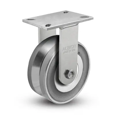 Albion 410 series 8″ x 3″ kingpinless heavy duty rigid caster delivers superior strength in rugged applications. Typical applications include conveyor-drawn tow-trucks, heavy duty bakery racks, production dollies, and heavy duty dough troughs. This drop forged v-grooved caster is finished with environmentally friendly RoHS Zinc plating for greater corrosion resistance than paint.