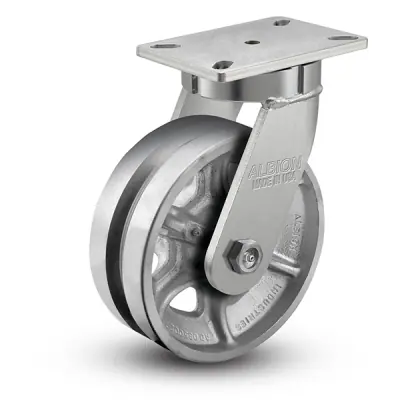 Albion 410 series 8″ x 3″ kingpinless heavy duty swivel caster with optional brake and swivel lock delivers superior strength in rugged applications. Typical applications include conveyor-drawn tow-trucks, heavy duty bakery racks, production dollies, and heavy duty dough troughs. This v-grooved cast iron caster is finished with environmentally friendly RoHS Zinc plating for greater corrosion resistance than paint.