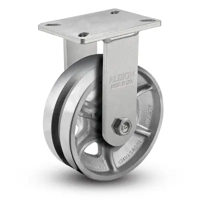 Albion 410 series 10″ x 3″ kingpinless heavy duty rigid caster delivers superior strength in rugged applications. Typical applications include conveyor-drawn tow-trucks, heavy duty bakery racks, production dollies, and heavy duty dough troughs. This v-grooved cast iron caster is finished with environmentally friendly RoHS Zinc plating for greater corrosion resistance than paint.