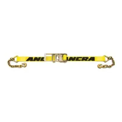 Ancra 3-inch x 30-foot flatbed ratchet strap with chain anchors and 33-inch fixed ends. Ideal for any heavy-duty tie-down jobs with extra-abrasive cargo, up to 5400 lbs. (2449.4 kgs) using 41632-14. Webbing with ratchet buckle 48965-10.