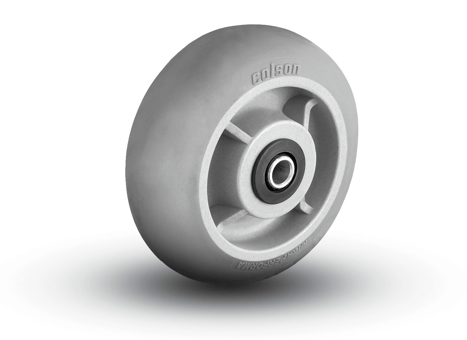Features a cushion grey Performa tread (durometer 65±5 Shore A scale) bonded to a black Polyolefin wheel core. Performa wheels have been rigorously tested and approved by an independent lab and meet the requirements of federal specification FF-C-88C. This specification requires an average electrical resistance of less than 250,000 ohms.