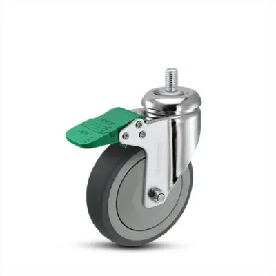 MedCaster Chrome Hospital (FX) 125mm x 32mm directional lock threaded stem caster with premium electropolished chrome for medical applications. Rolls easily and quietly. Made with Antimicrobial Thermoplastic Rubber & offers various fitting options.