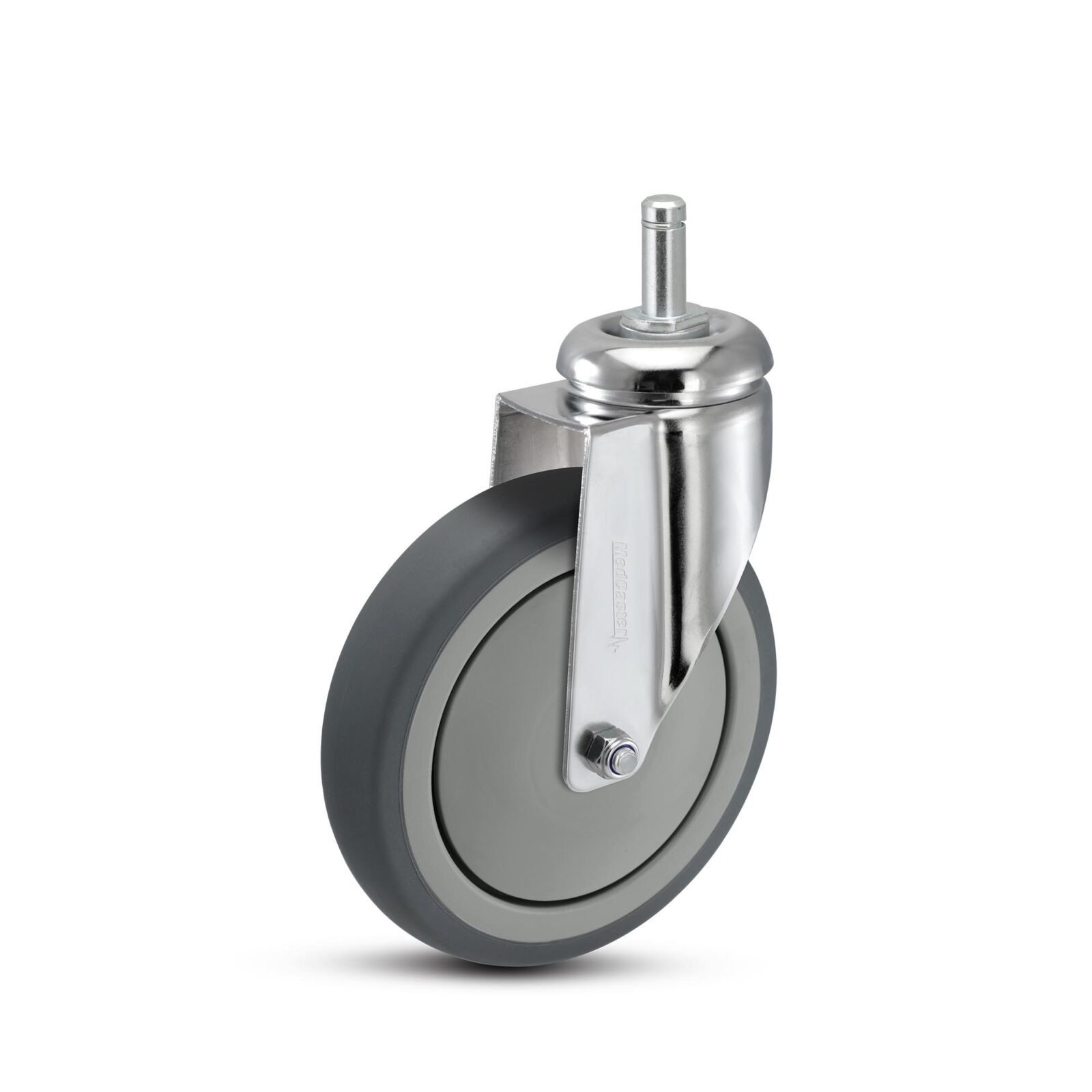 MedCaster Chrome Hospital (FX) 150mm x 32mm swivel caster with premium electropolished chrome for medical applications. Rolls easily and quietly. Made with Antimicrobial Thermoplastic Rubber. Choose from various hollow kingpin fittings options before requesting your quote.
