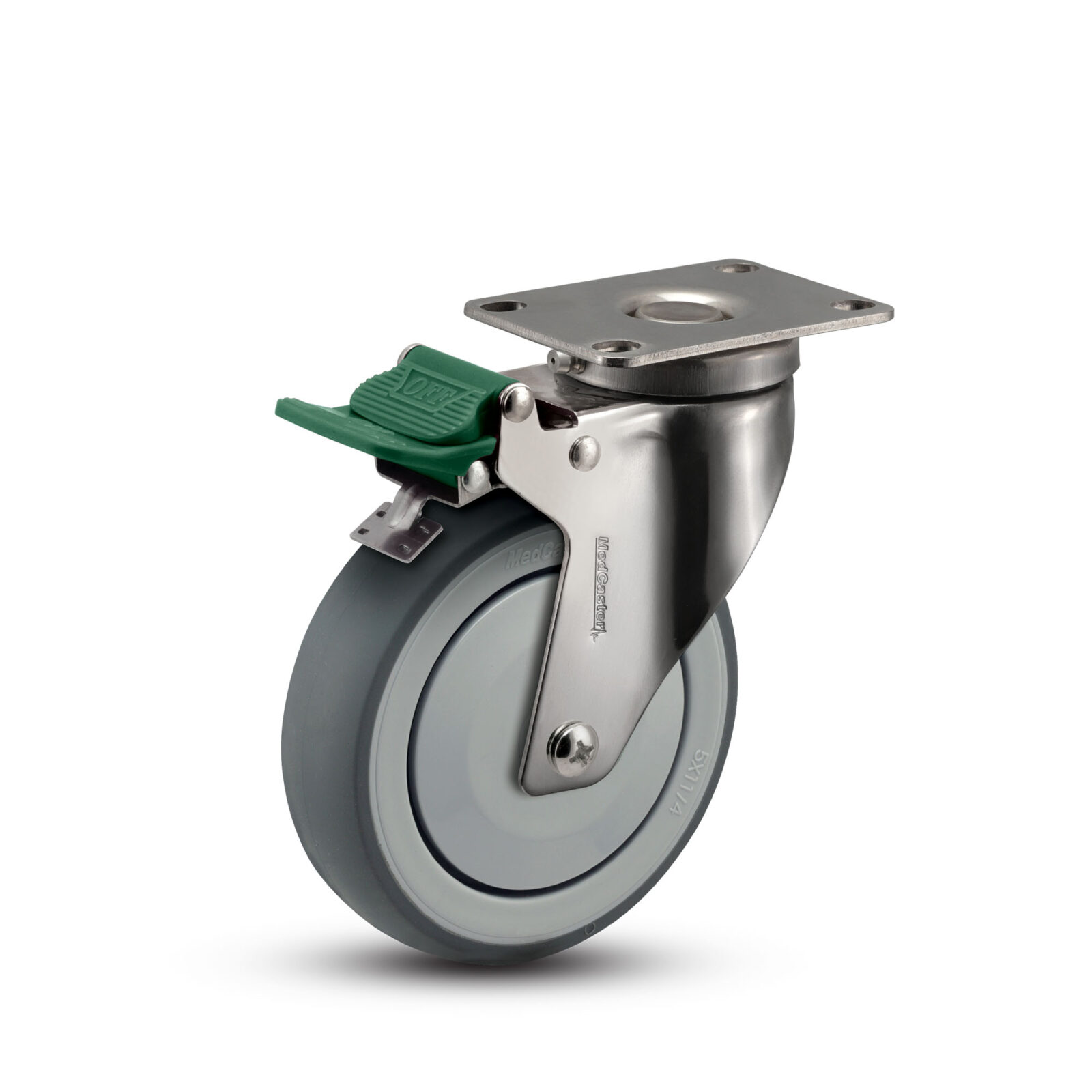MedCaster Stainless Steel (SX) 125mm x 32mm directional lock swivel caster made for institutional use (case carts, lab equipment, and sterilization carts). The precision ball bearings make for easier rollability and the pedal brake design makes for an easy on/off function. Green brake locks swivel only for easier tracking. The Thermoplastic Rubber material withstands a 210 degree Fahrenheit wash down. Durometer: of 85A +/- 5. Choose from various top plate options before requesting your quote.