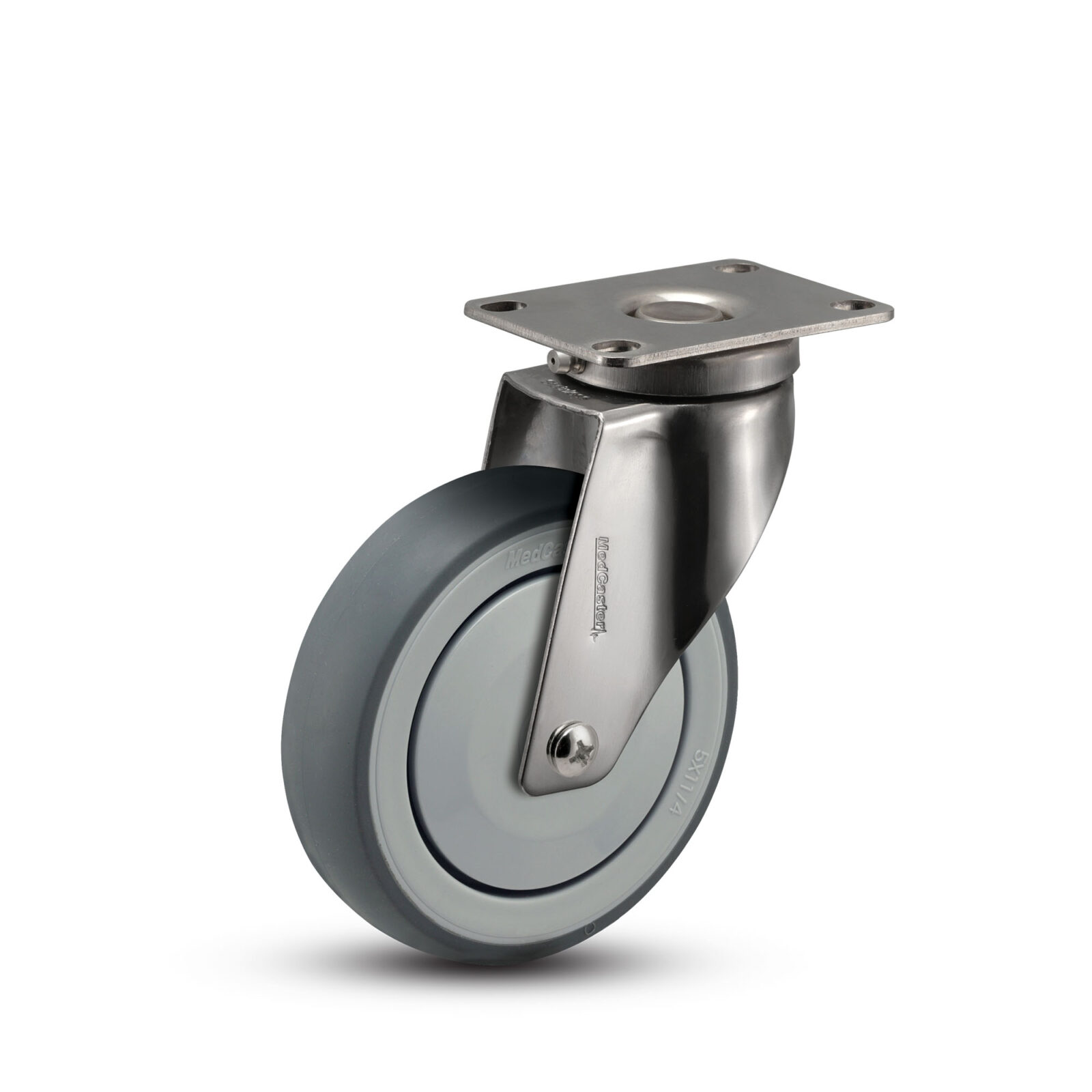 MedCaster Stainless Steel (SX) 125mm x 32mm swivel plate caster made for institutional use (case carts, lab equipment, and sterilization carts). The precision ball bearings make for easier rollability. The Thermoplastic Rubber material withstands a 210 degree Fahrenheit wash down. Durometer: of 85A +/- 5. Choose from various top plate options before requesting your quote.
