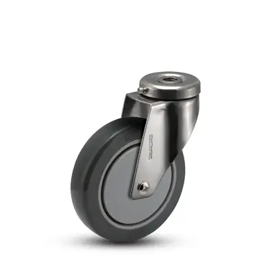 MedCaster Stainless Steel (SX) 150mm x 32mm swivel caster with Polyurethane material. Built for institutional uses like case carts, lab equipment, wire shelving, animal cages, pharmaceutical research equipment, and sterilization carts. The precision ball bearings make for easier rollability. This model withstands a 180 degree Fahrenheit wash down. Durometer: of 95A +/- 5. Choose your hollow kingpin option before requesting your quote.
